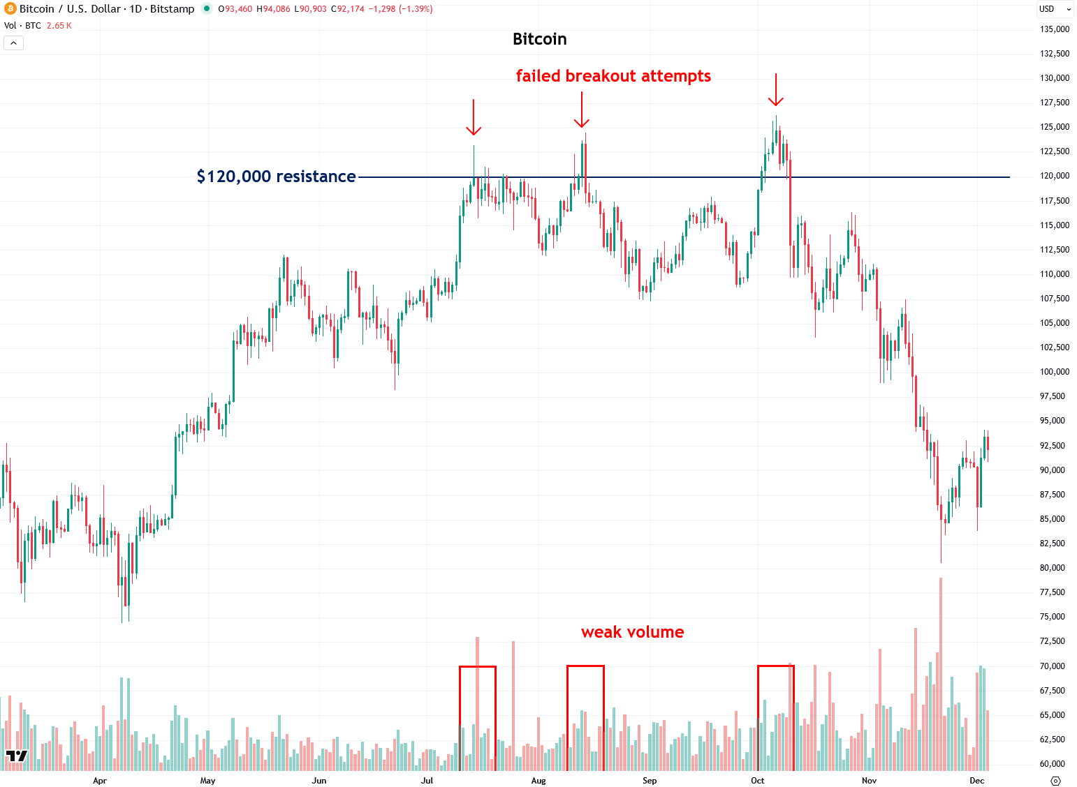Bitcoin also displayed a similar pattern from July to October of this year, with three separate breakout attempts above the key $120,000 resistance level. However, each attempt occurred on weak volume and lacked any follow-through, leaving Bitcoin starved of the fuel needed to sustain a breakout.