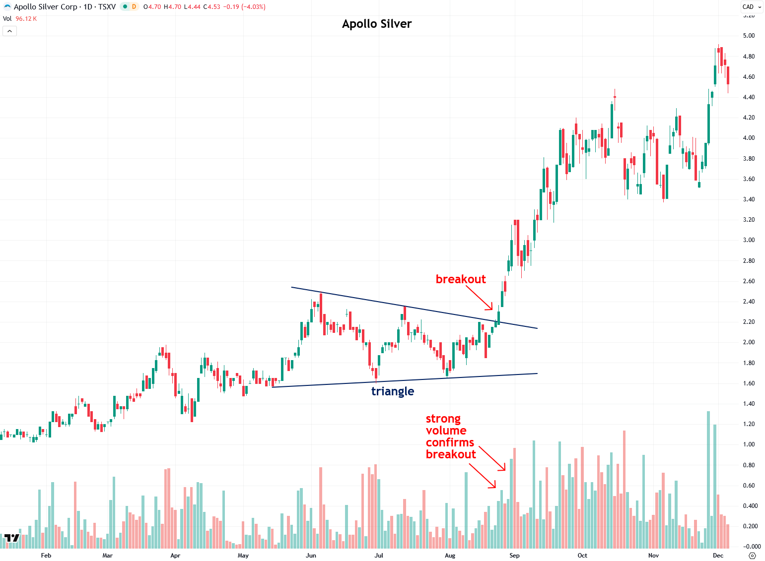 Next, let’s look at the junior silver miner Apollo Silver, which I wrote a bullish report on in late June of this year. It had formed a triangle pattern from June to August, and then it broke out on strong volume and subsequently more than doubled in just a matter of months, and it is still going strong.