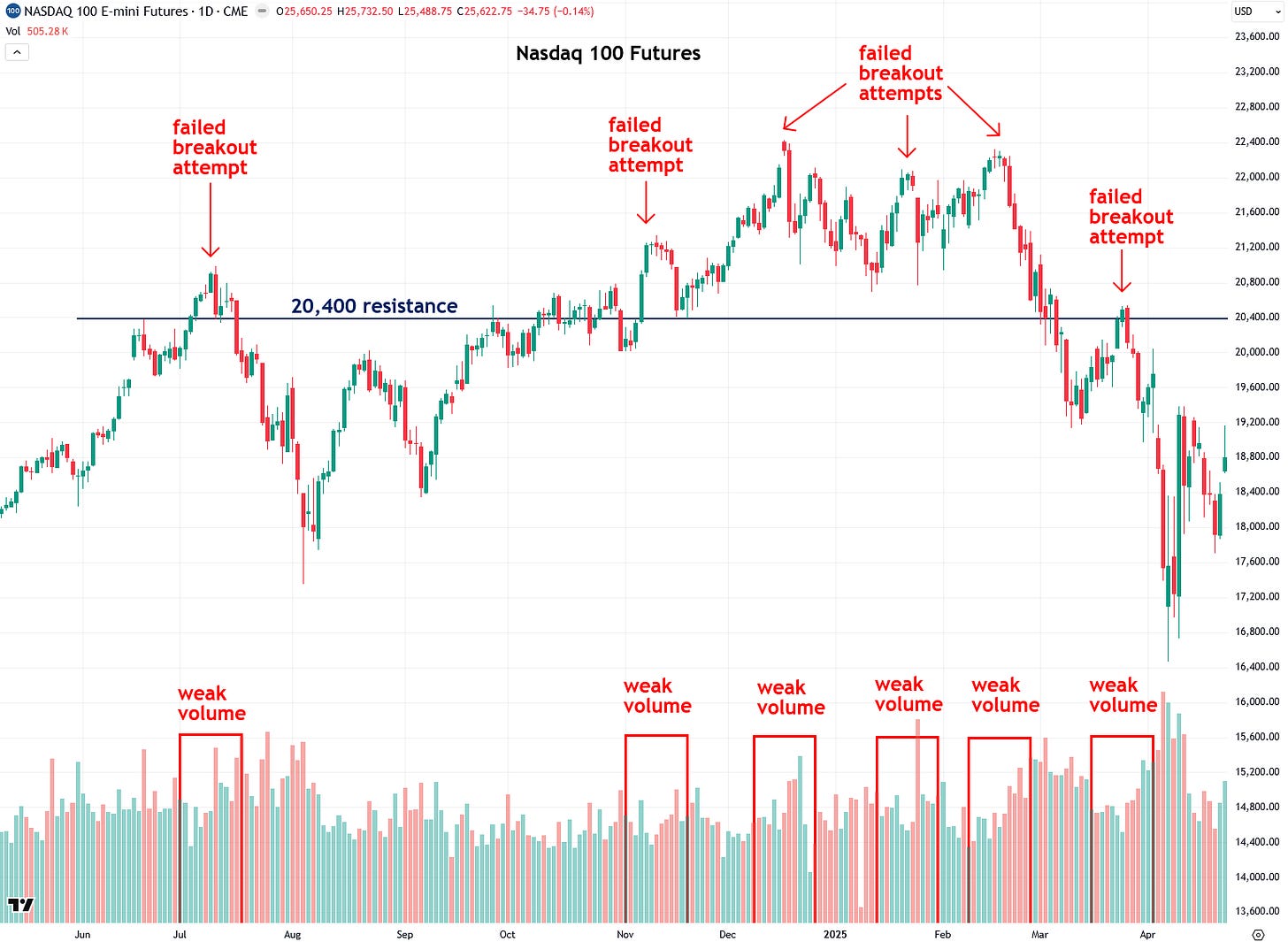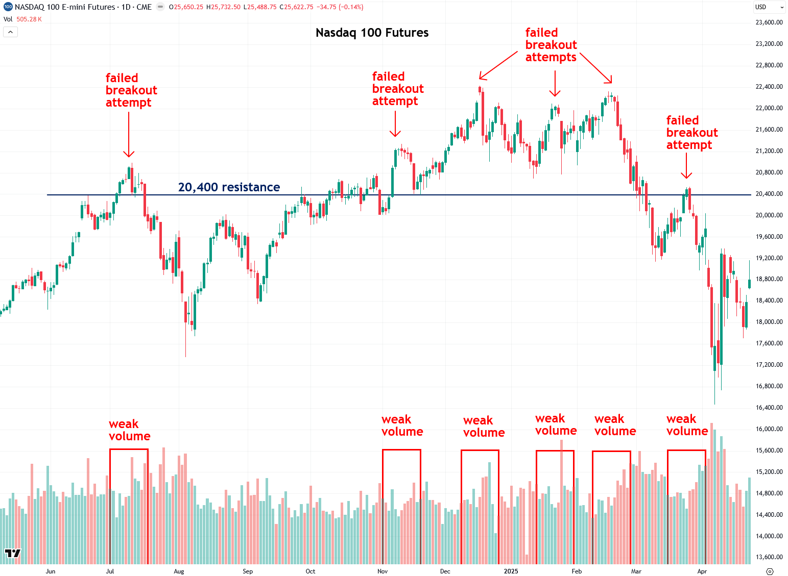 Another example of a failed breakout, or rather several, comes from the Nasdaq 100 futures between spring 2024 and spring 2025. During that time, the Nasdaq repeatedly struggled with the 20,400 resistance level. The first breakout attempt came in July 2024 on low volume and failed. A second attempt in November, also on low volume, met a similar fate.