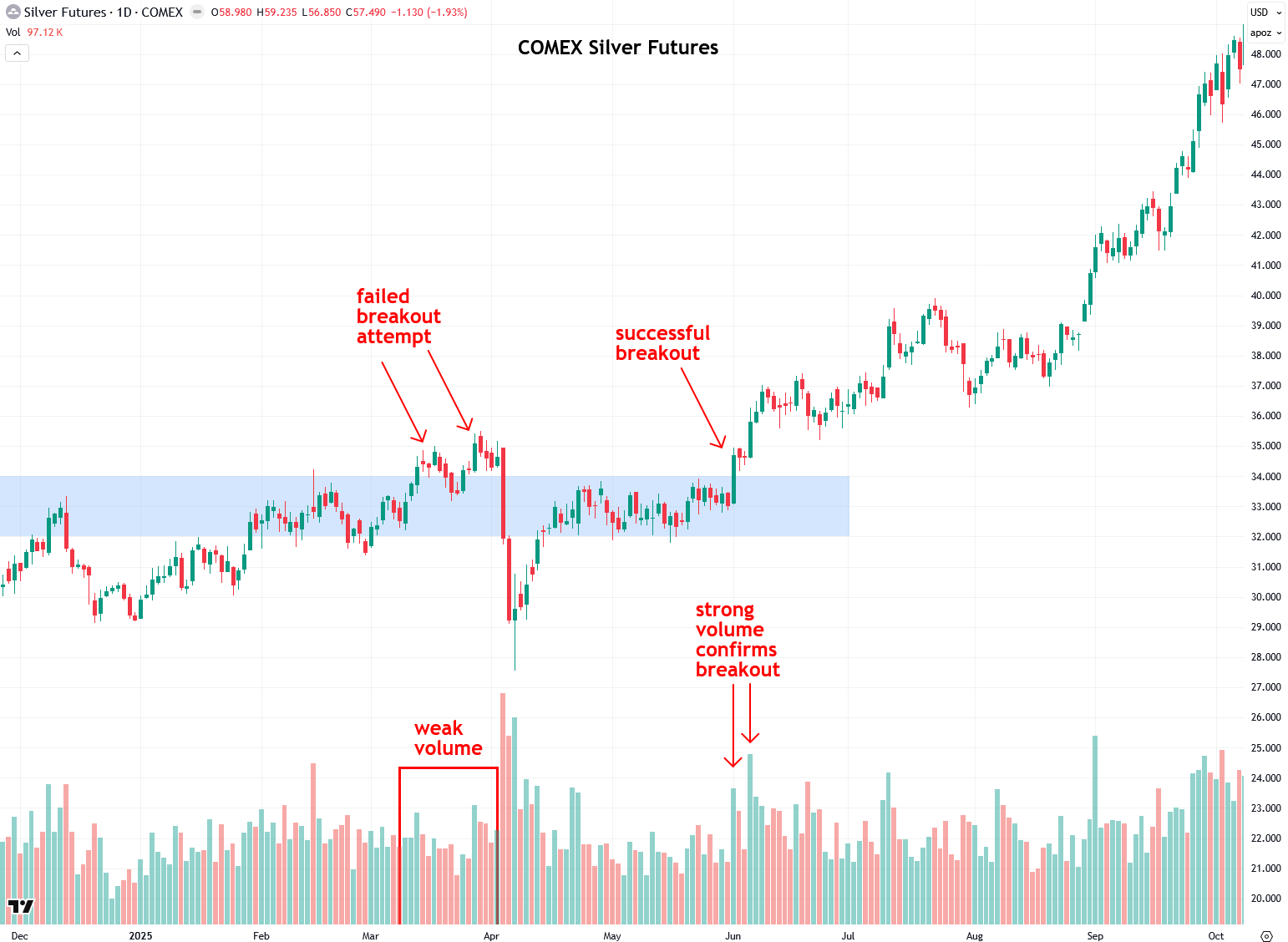 Interestingly, just two months later, silver made another attempt to break out above the $32 to $34 resistance zone, but this time on strong volume. Not surprisingly, the breakout succeeded, kicking off a rally that continues to this day as silver approaches $60 an ounce.