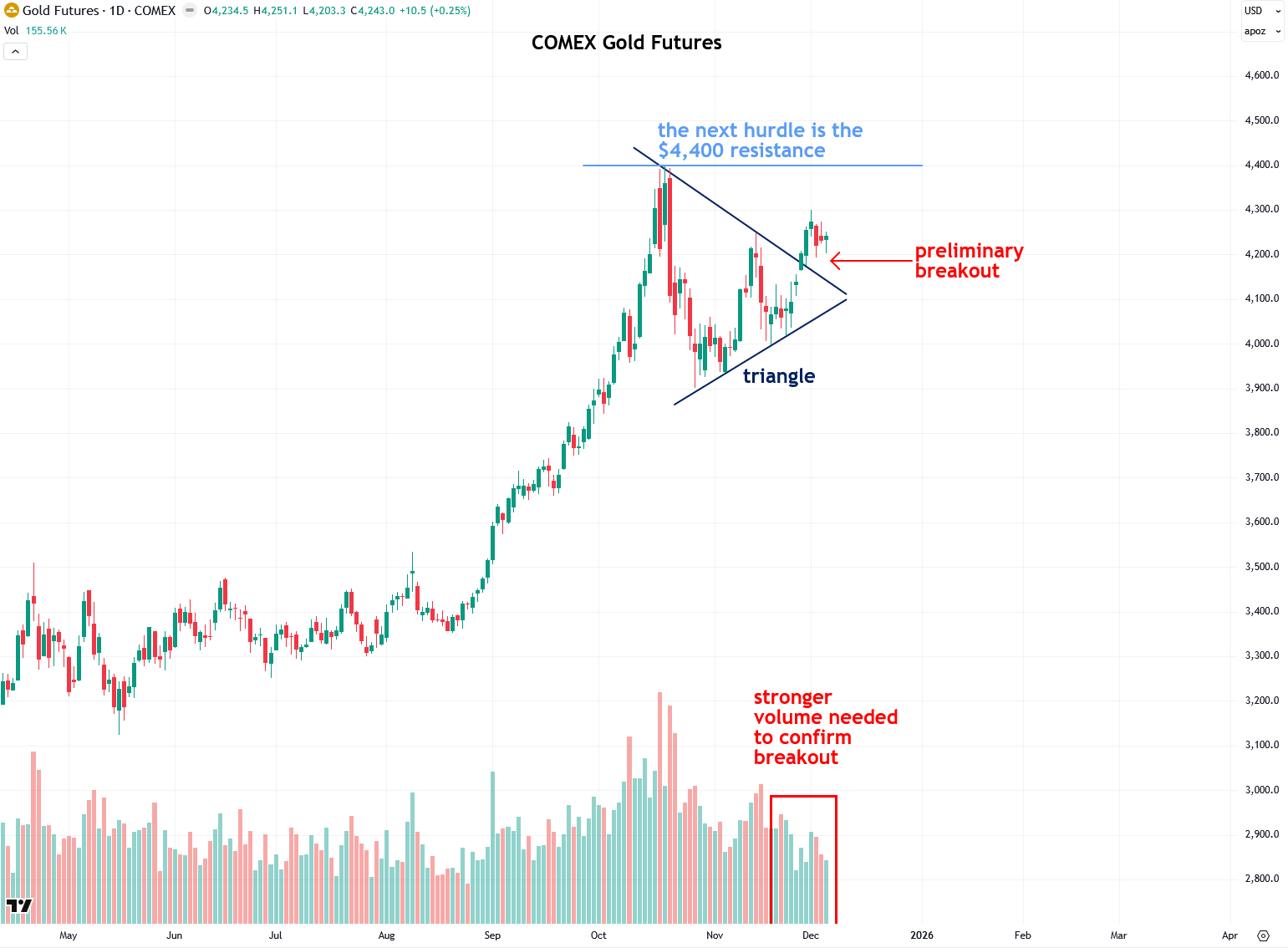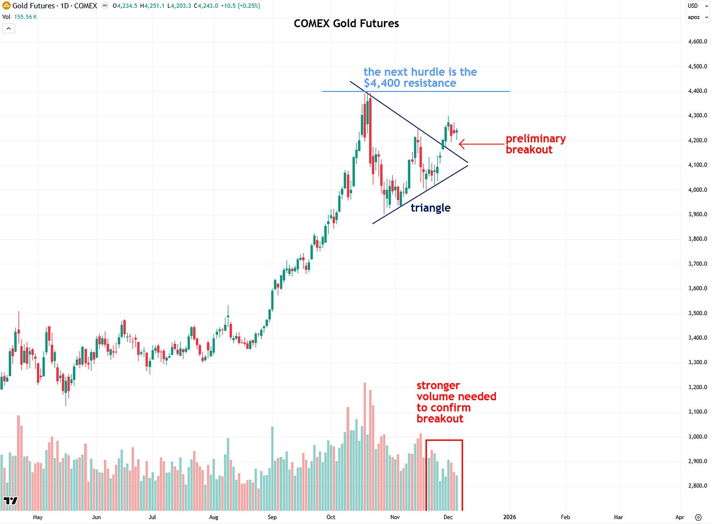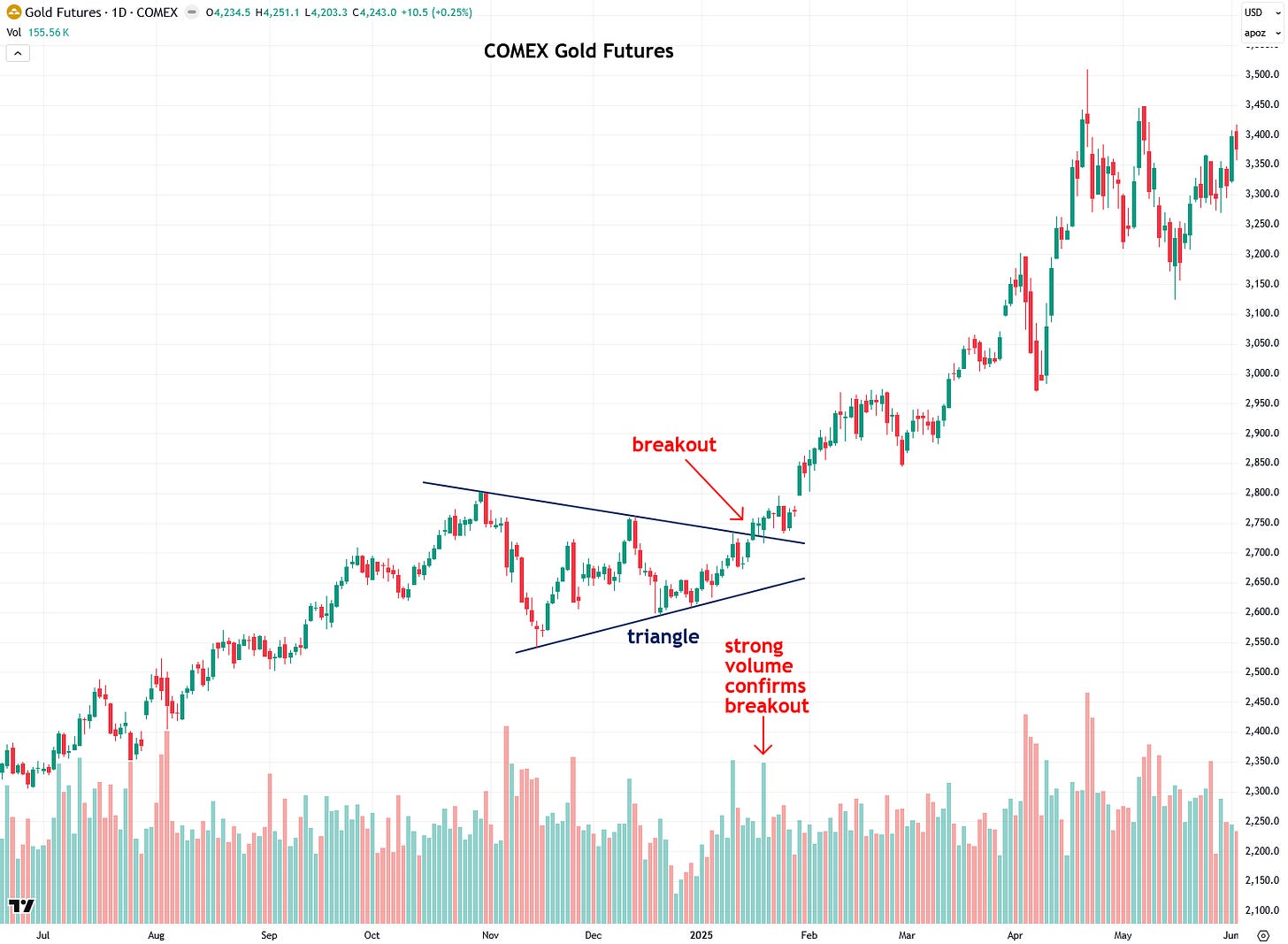 Now that we’ve finished today’s lesson, I want to apply those principles to analyze the recent breakouts in gold and silver, with a focus on volume, starting with COMEX gold futures. As I’ve mentioned in recent updates, gold broke out of a triangle pattern last week, but there wasn’t enough volume to confirm that this is the real or ultimate breakout.