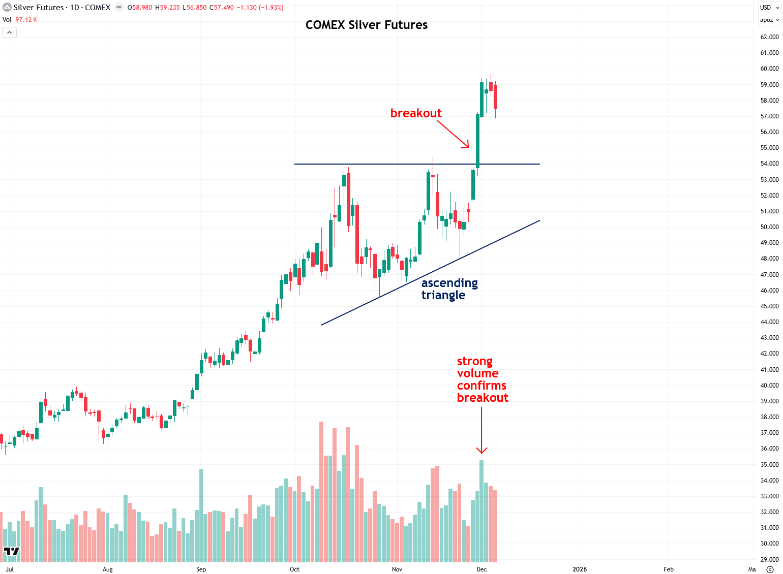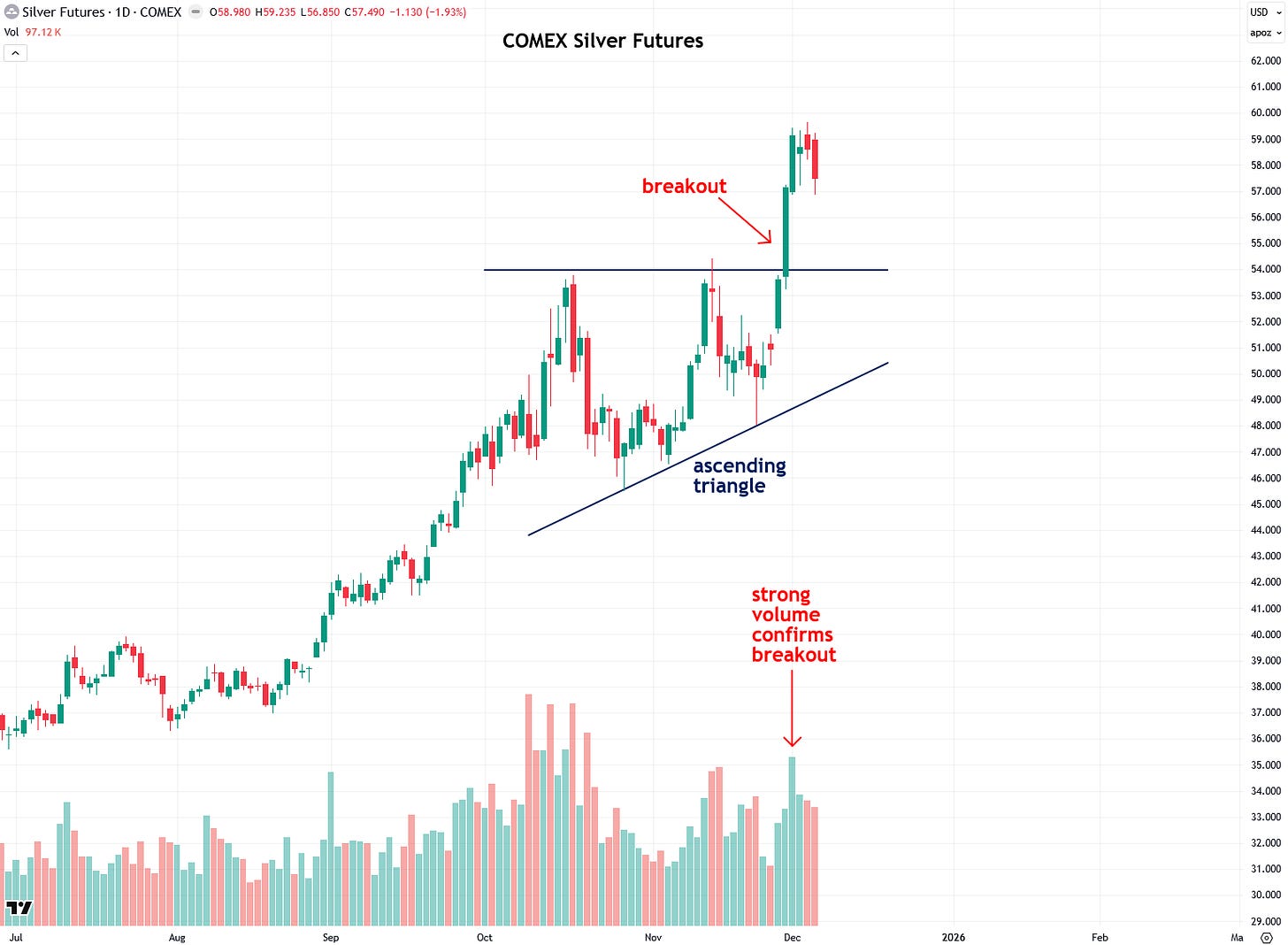 Next, let’s look at COMEX silver futures, which are in a much stronger and less ambiguous technical position than gold. That’s because silver broke out of its ascending triangle pattern, including the horizontal $54 resistance level, on strong volume. This is especially notable given that the breakout occurred the day after Thanksgiving, a shortened trading session when volume is typically light.