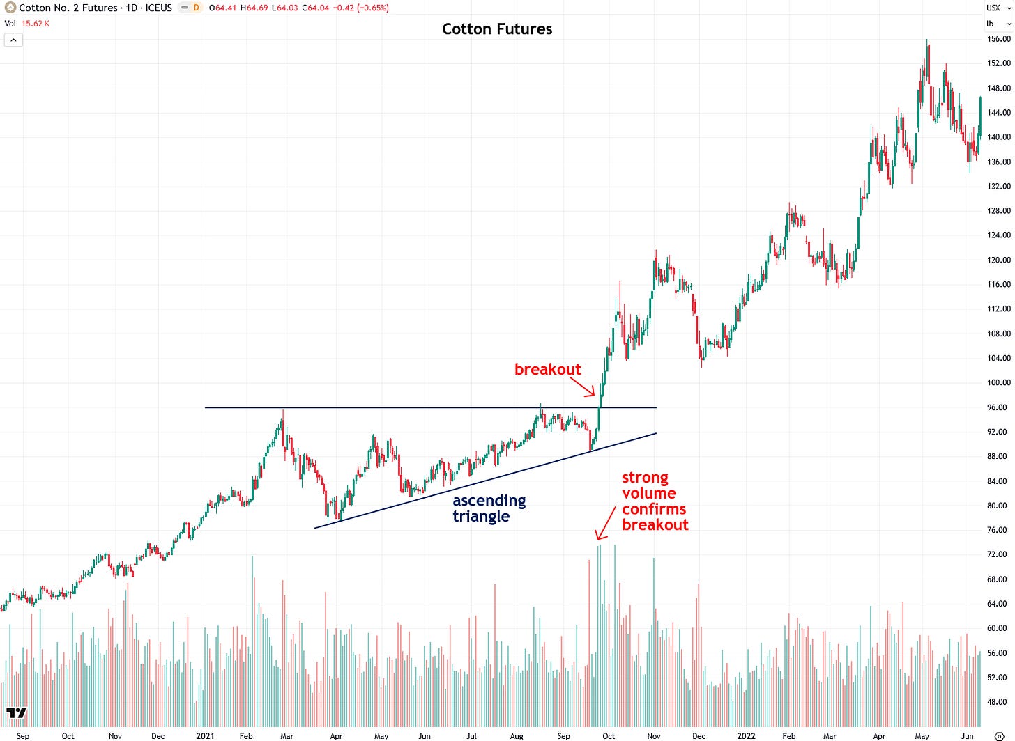 For much of 2021, an ascending triangle had formed in cotton with a resistance level of $96, and it finally broke out in September of that year with multiple days of strong volume for added confirmation. That breakout led to a surge as high as 156 by May 2022.