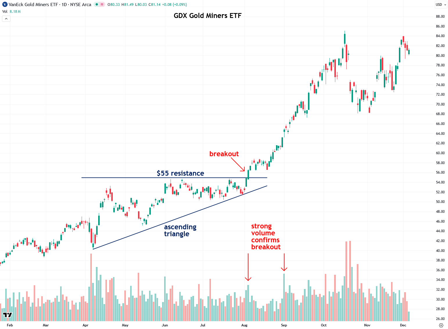 Next, let’s look at the popular VanEck Gold Miners ETF (GDX), which formed an ascending triangle in spring 2025 and broke out above its $55 resistance in early August with strong volume, resulting in a quick surge to $82 over the next couple of months.