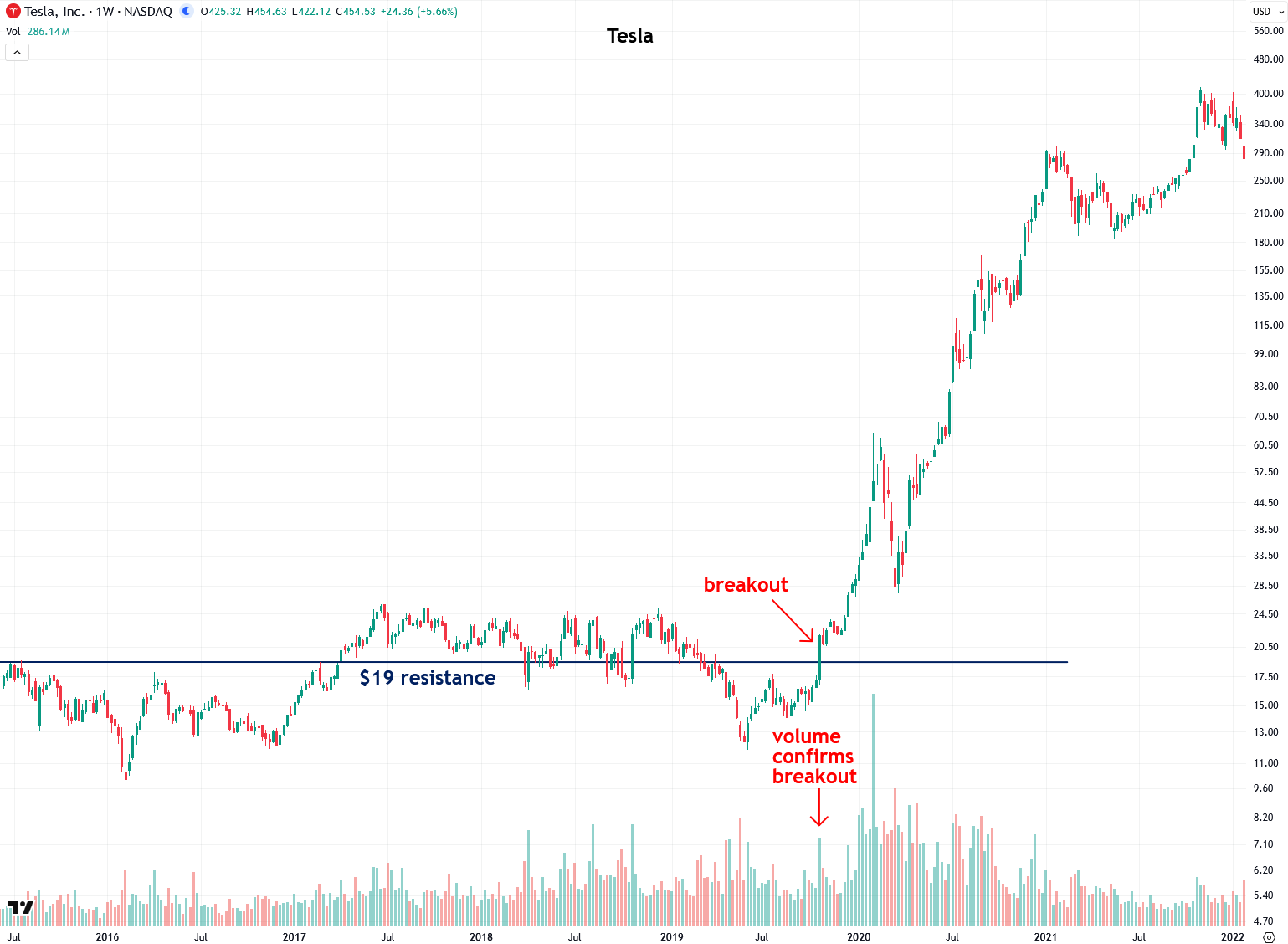 Next, let’s look at one of history’s most stellar stock performances, Tesla, using its weekly chart. From 2016 to 2019, it had been trading above and below the key $19 level, but when it finally surged above $19 on heavy volume in October 2019, that move kicked off its surge to $415 by November 2021 for an incredible gain of roughly 2,000%.
