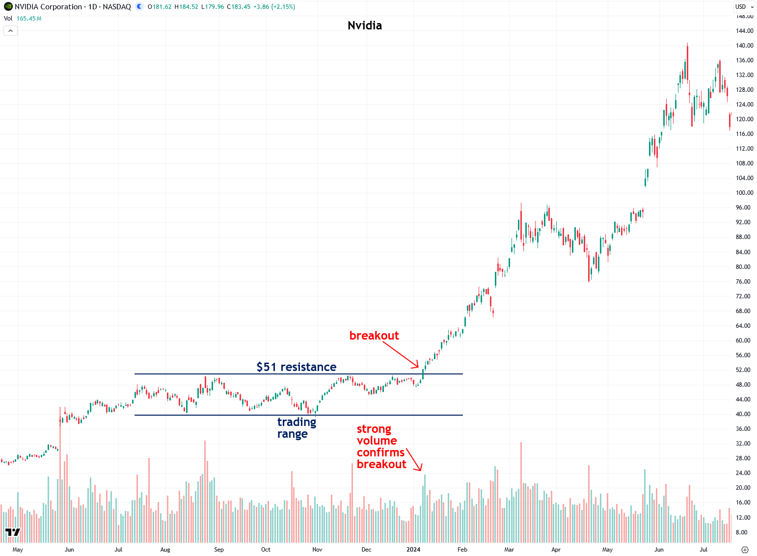 Next, let’s move on to some stocks, starting with the current market darling Nvidia. Its blistering rally began with a trading range in late 2023, and once it broke out above the $51 resistance on heavy volume, it was off to the races. It soared as high as $140 by May 2024 for a nearly threefold gain.