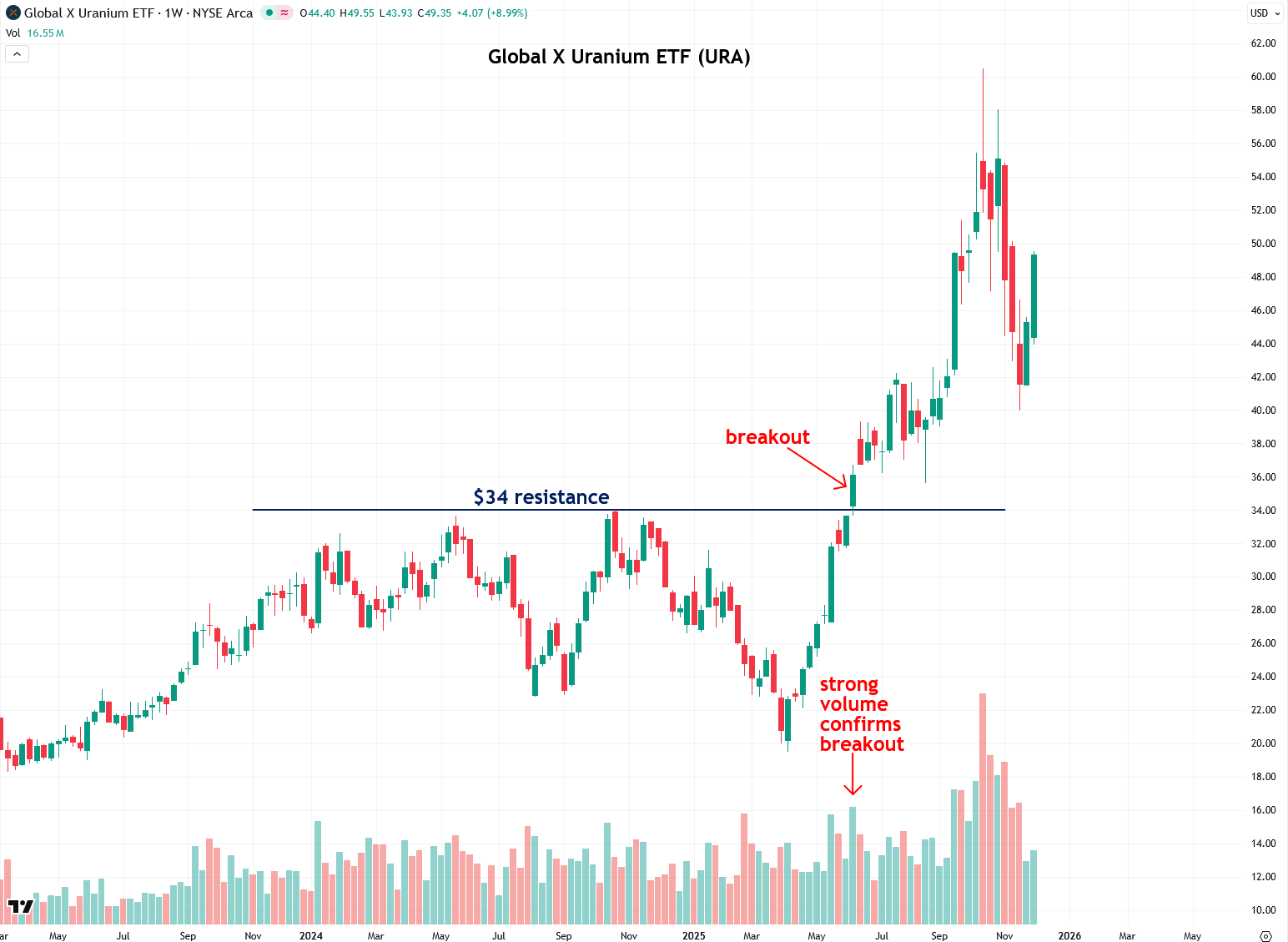 For much of 2024 and early 2025, there was a clear resistance level at $34, but URA finally broke above it in May 2025 on strong volume and subsequently rallied to $60 in the following months.