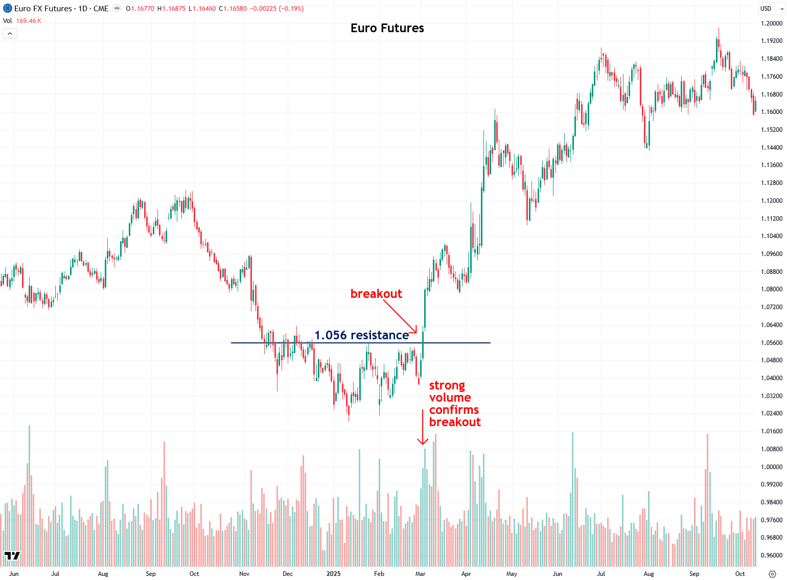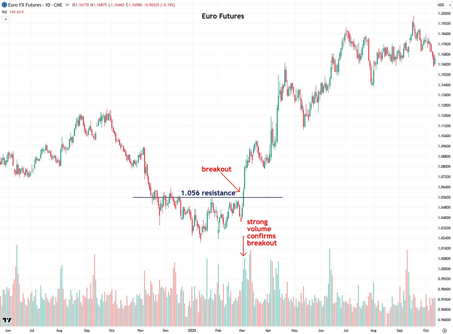 Finally, let’s take a look at euro futures, which broke out above the 1.056 resistance level on heavy volume this past March and continued to rally into the fall.