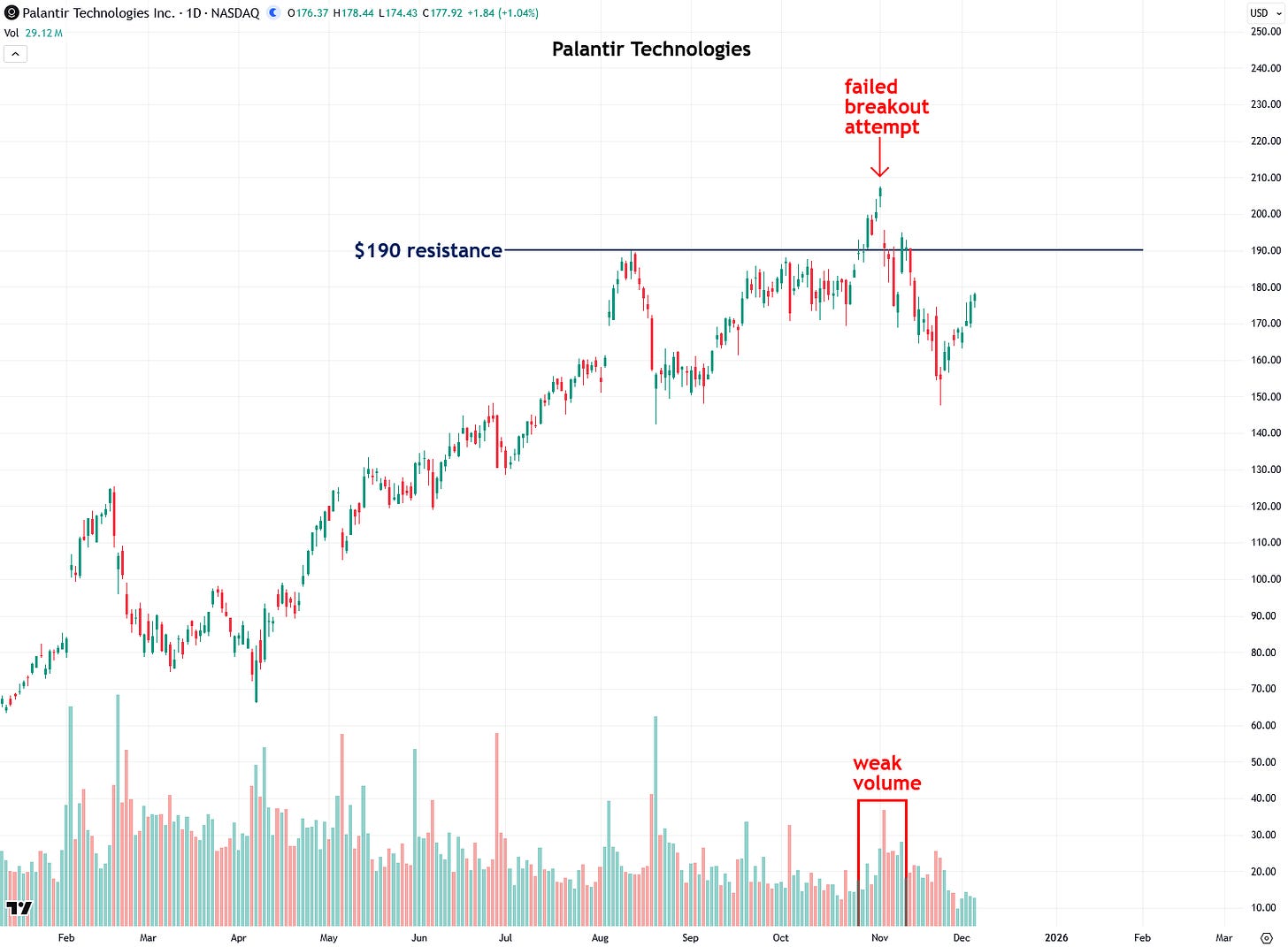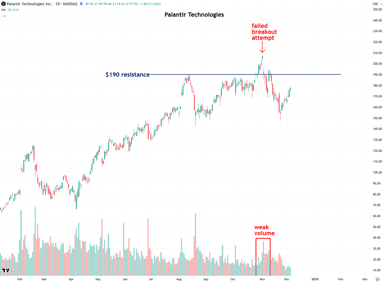Finally, let’s take a look at one of today’s tech darlings, Palantir Technologies (PLTR). Over the past summer, the stock was struggling to break above the $190 resistance level. It finally staged a breakout in late October, but there was very little volume to support the move.