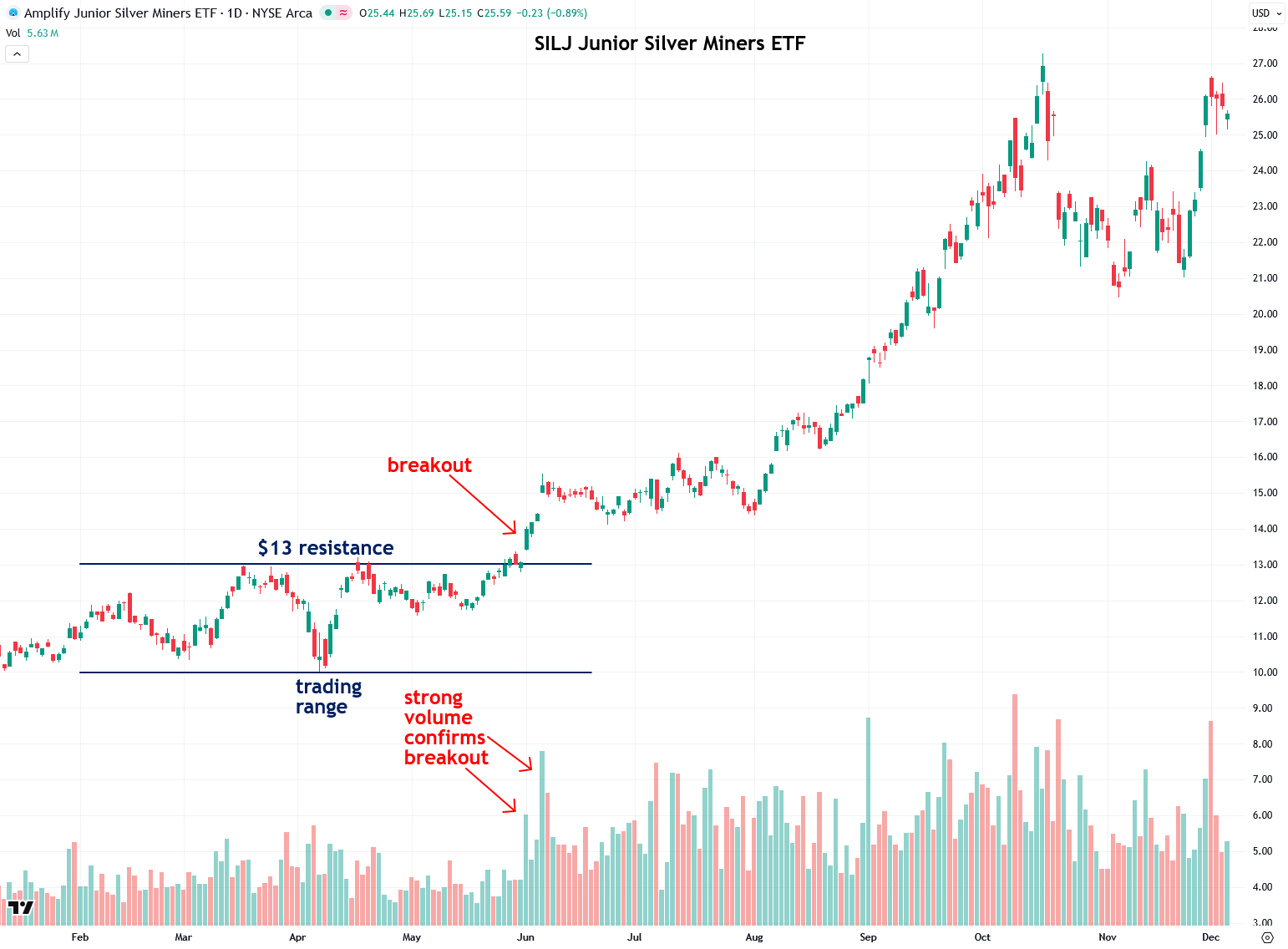 A similar breakout occurred in the Amplify Junior Silver Miners ETF (SILJ) after it had been in a trading range in the spring of 2025 and then broke out above the $13 resistance, accompanied by multiple days of strong volume. That breakout ultimately led to a doubling in price in just four and a half months.