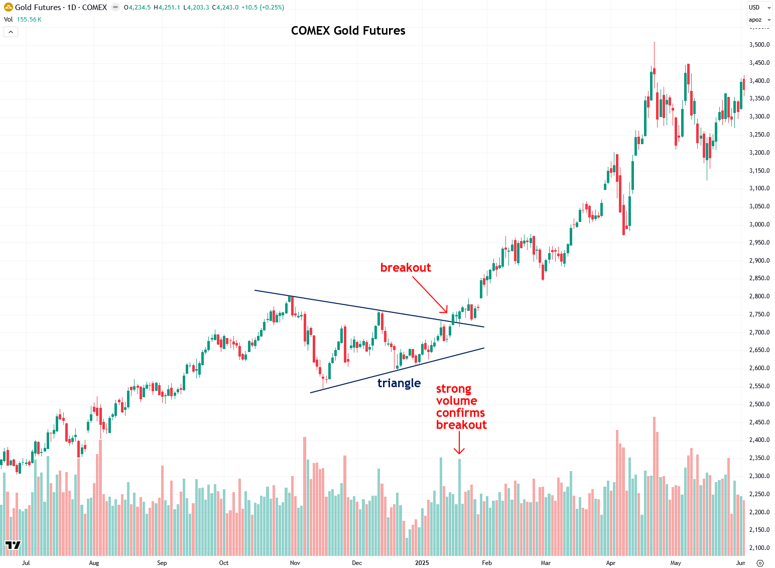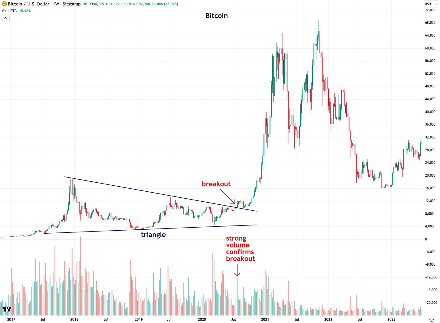 Another beautiful example in gold came later in 2024, when a breakout from a triangle pattern that I wrote about led to a strong surge from $2,750 to $3,500 over the following few months. Notice how volume surged on the day of the breakout, confirming it.