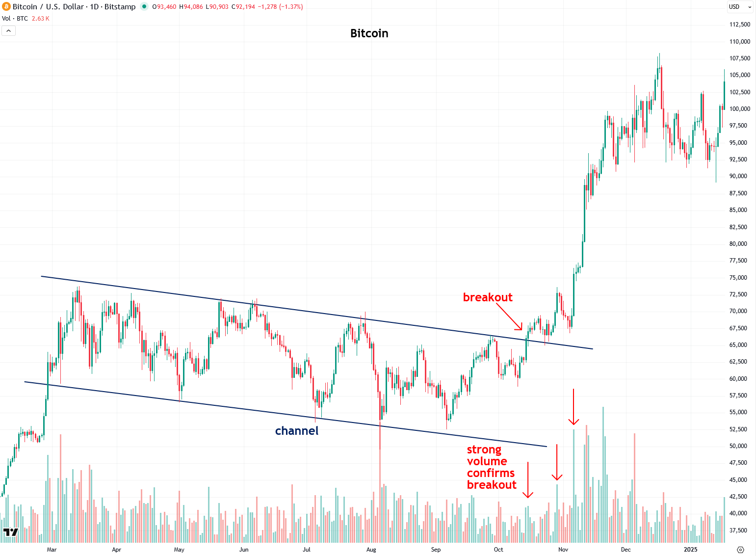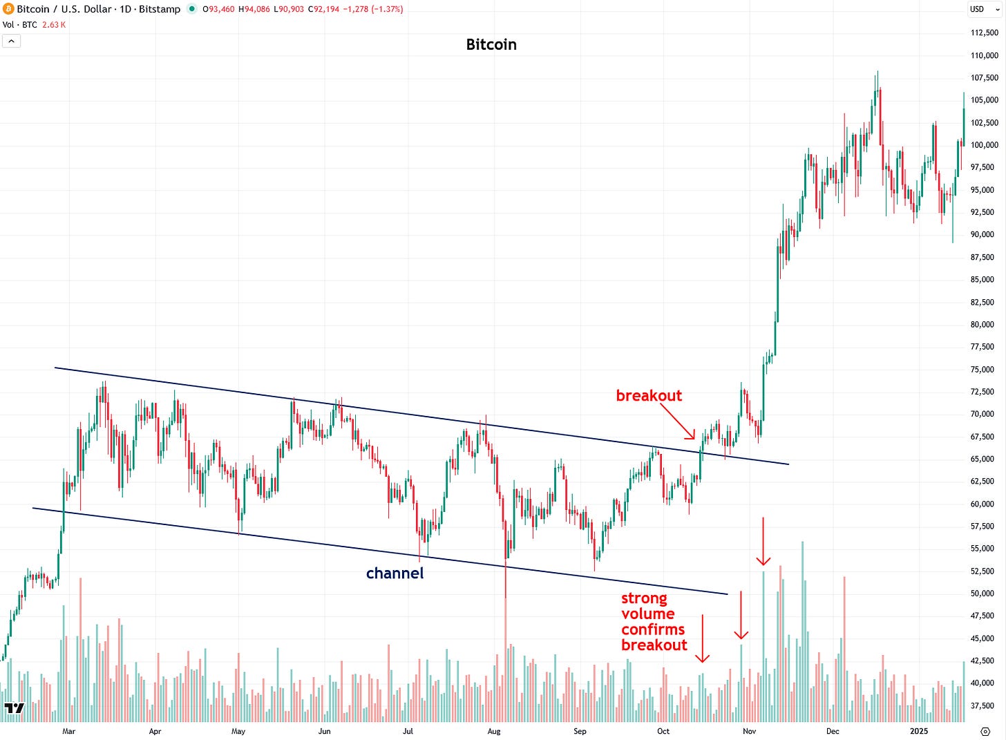 Bitcoin also staged another important breakout a year ago, emerging from a channel pattern on strong volume, which I identified as it was happening. It promptly surged from $65,000 to $108,000 in roughly two months.