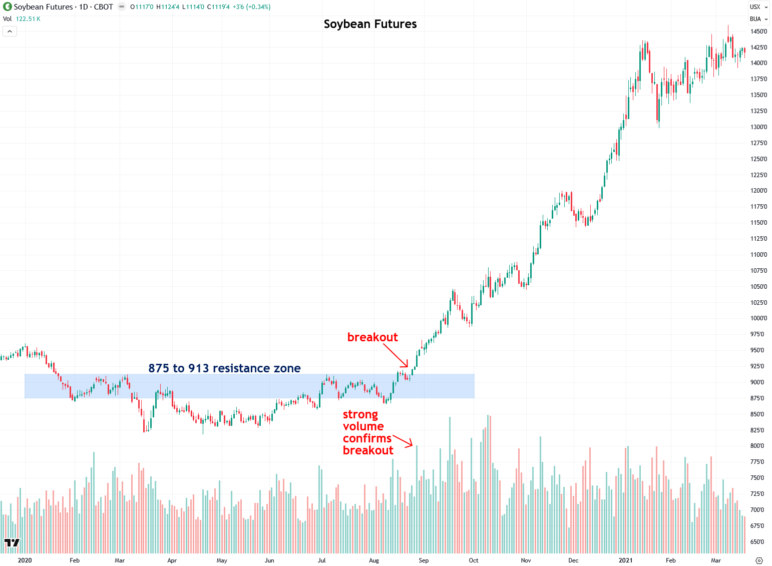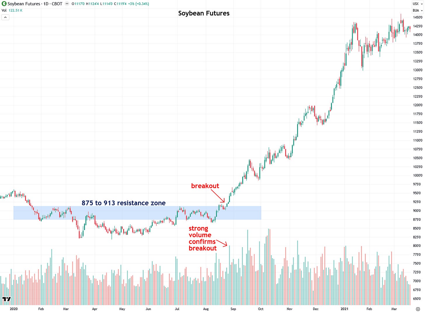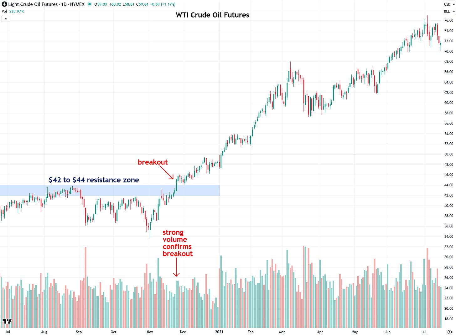 Next, let’s look at an exciting example in crude oil futures from 2020, which had been capped under the $42 to $44 resistance zone until the high-volume breakout in November kicked off a rally that carried prices as high as $130 by March 2022.