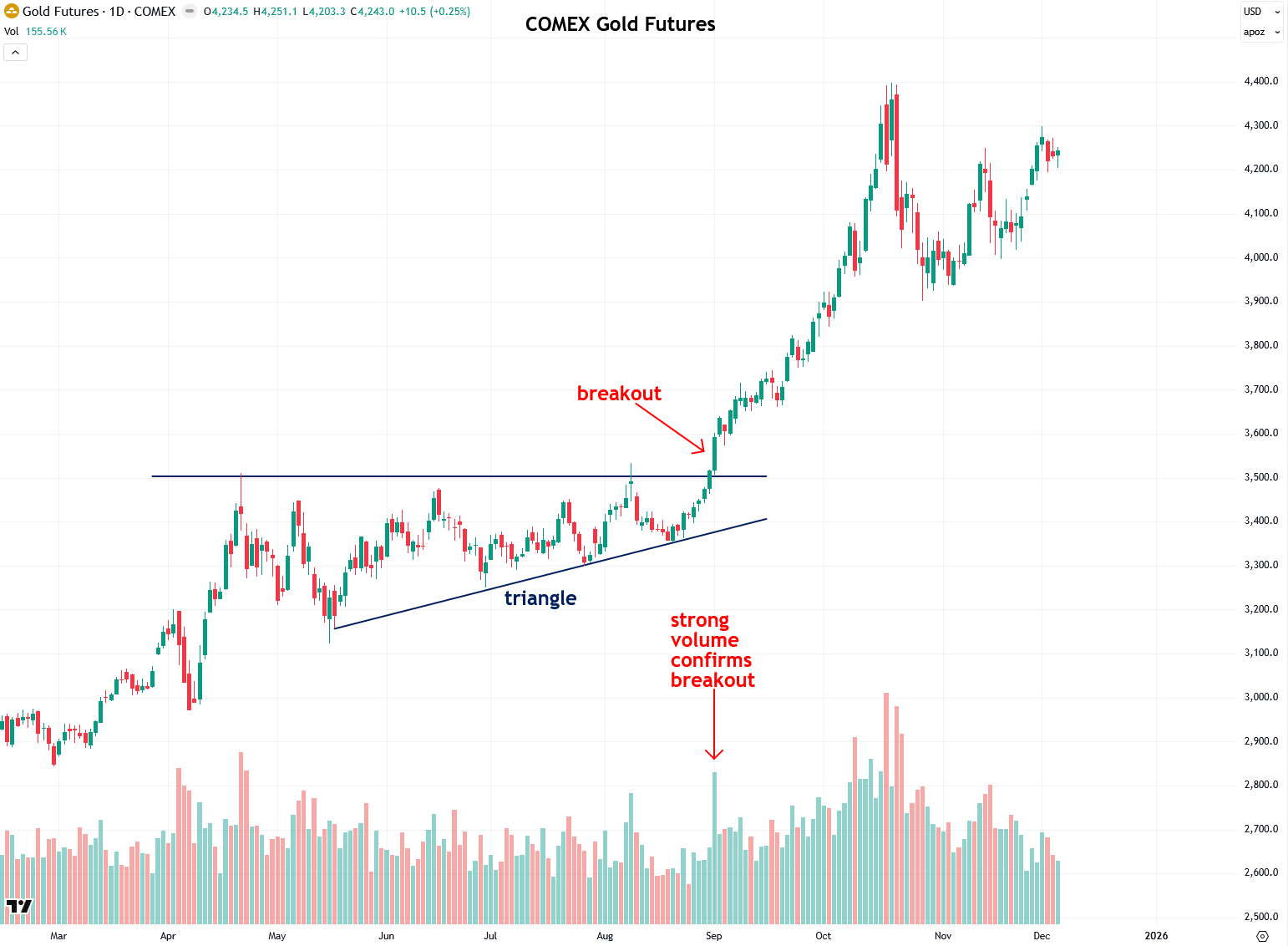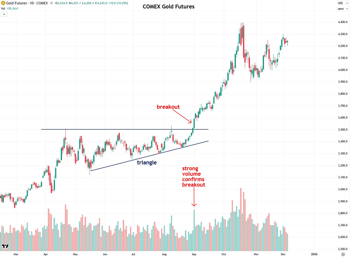 As if those two other textbook breakouts were not enough, it occurred yet again when gold broke out in September 2025 from the summer triangle pattern I had spotted, and volume spiked strongly, giving the go-ahead signal.