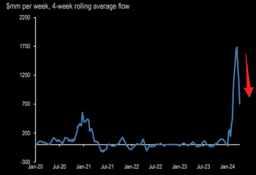 We also see the momentum of inflows in bitcoin dropping, which could add pressure to the cryptocurrency should there be another risk-off event.