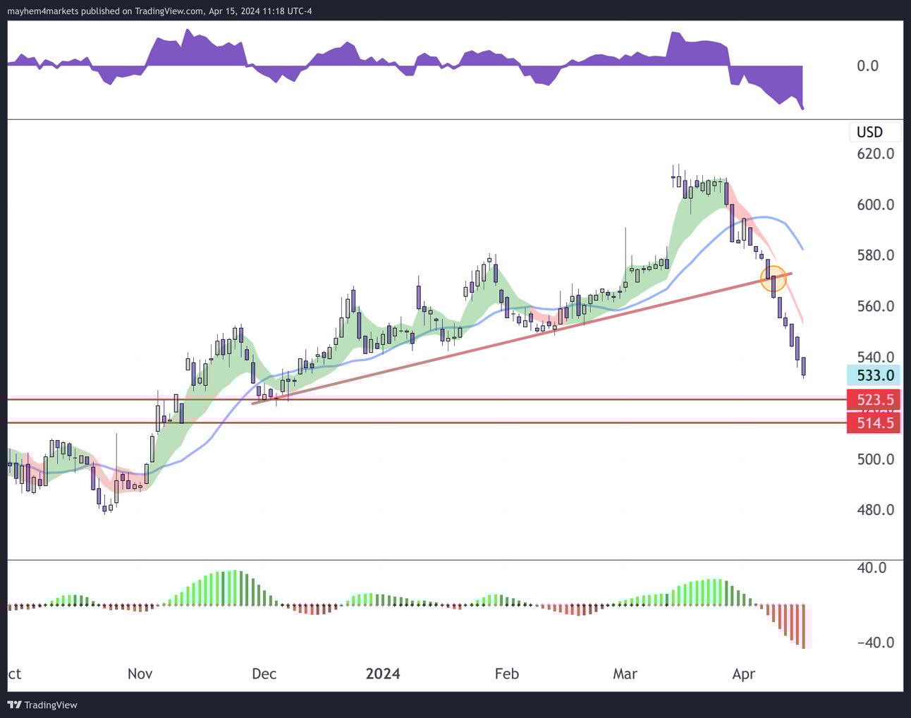 The downside momentum in lumber has been rather aggressive. The next areas of potential support that we’re watching are $523.50 and $514.50. The commodity is under increasing pressure as we see home building slowing.