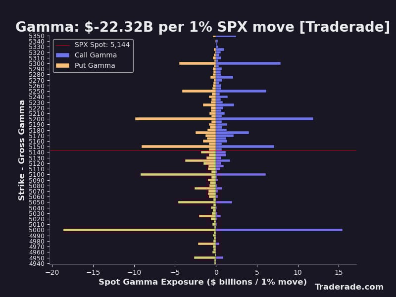SPX 5200 was taken out decisively last week as we fell below the 20-day moving average. Bringing into view 5,150 and 5,100 as potential areas of options-implied support and magnetism for price. Below 5,100 we have the largest area of full options chain positioning at 5,000.