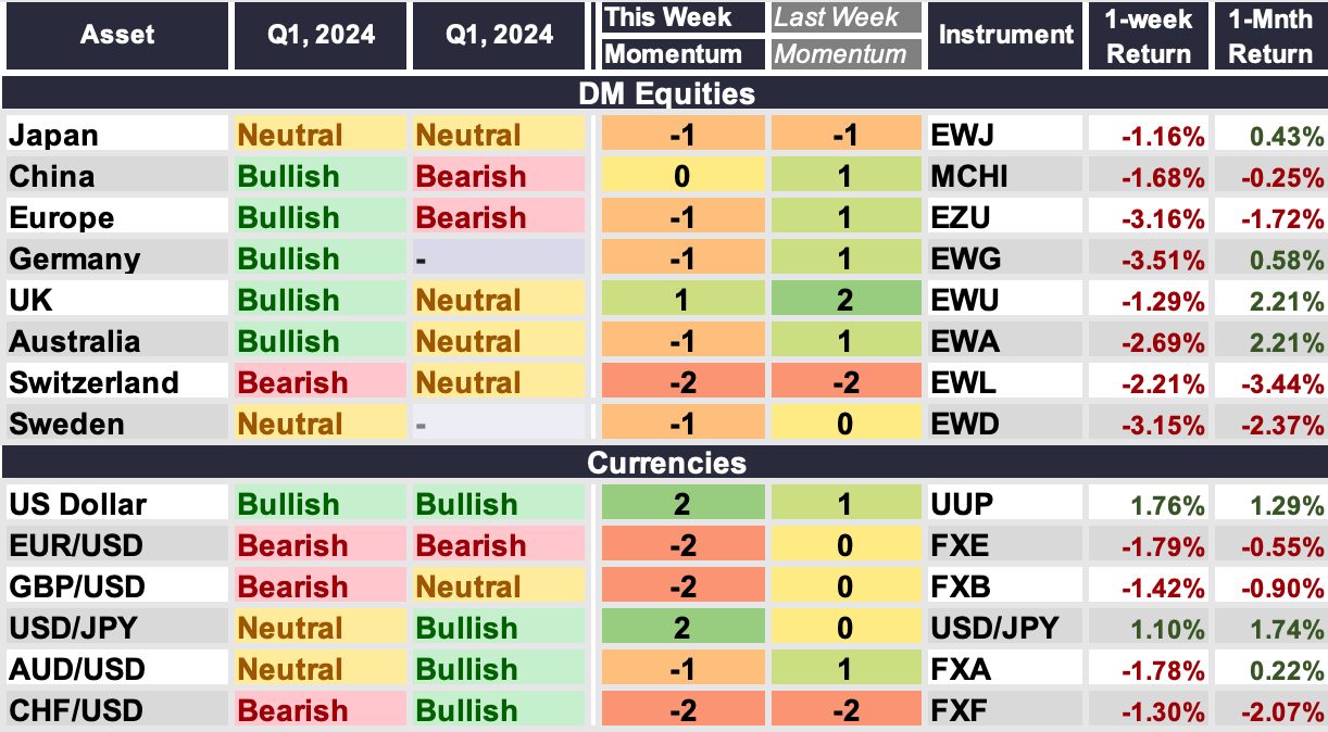 Equities and the Swiss Franc continue to signal very negative momentum.