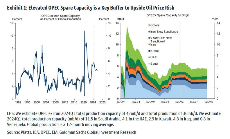 OPEC still has spare capacity they could unleash into any disruptive event that takes other capacity offline, which could help to buffer upside oil price risk to some degree depending on the scale and duration of any disruption to supply.