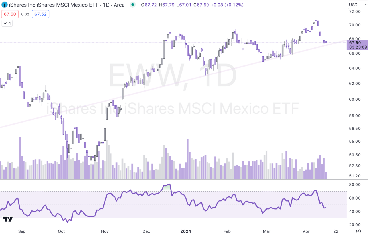 Mexico released inflation data last week. Headline inflation came in higher YoY compared to the previous month (4.42 vs. 4.4% Prior) but Core Inflation decelerated (4.55% vs. 4.62% prior). Industrial production also came in stronger, rising to 3.3% from 2.7% prior. Momentum in equities is slowing somewhat but the market still remains in an uptrend.