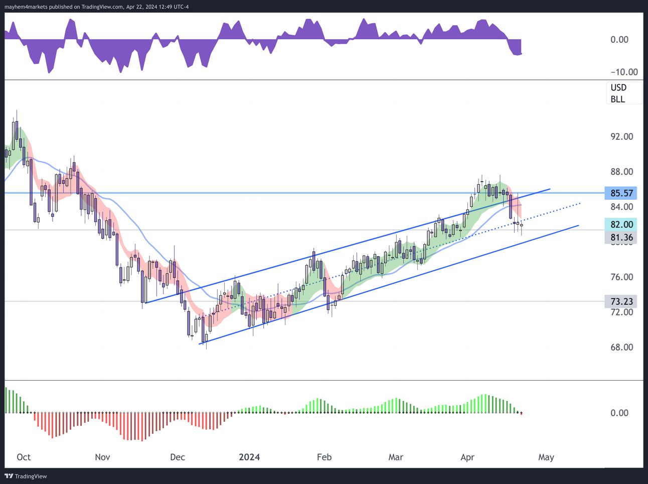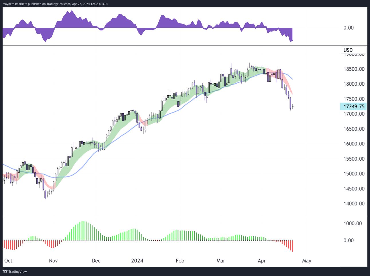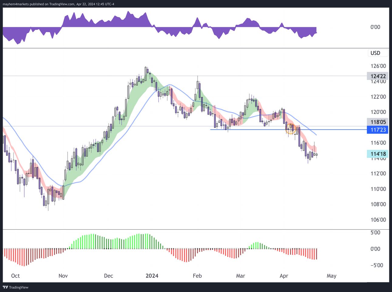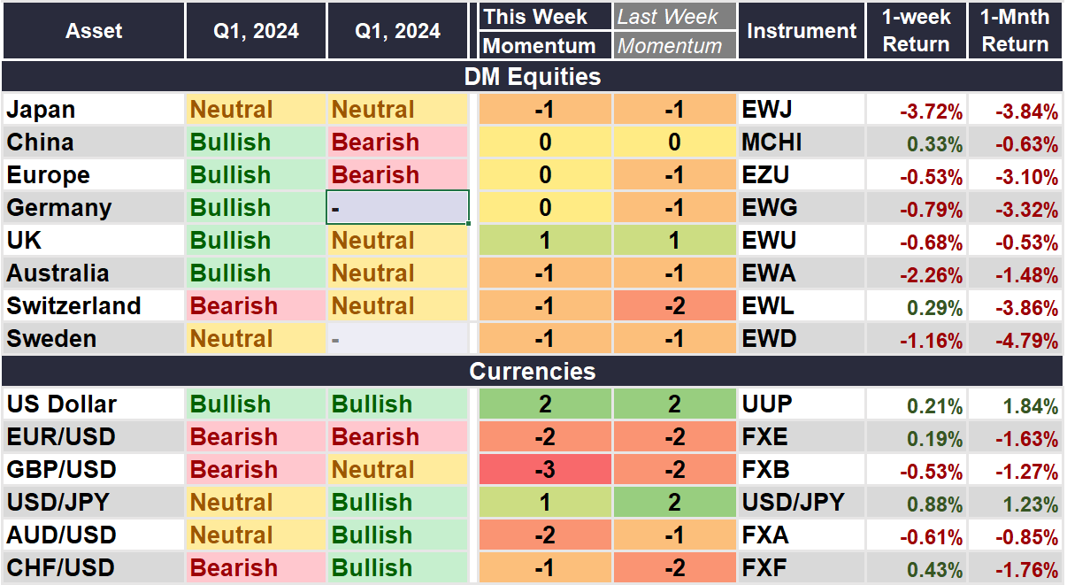 European equities continue to see pressure with US stocks selling off as well. This is the busiest week for European earnings as well with 29% of the Stoxx 600 reporting, including major companies such as SAP reporting today. We’re seeing momentum improve slightly but remain neutral. The EUR however, continues to see negative momentum with the stronger dollar and the ECB’s rate cut being confirmed for June, no matter what.