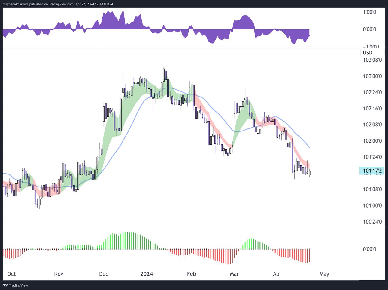 Downside momentum in the 2-year note is stabilizing to some degree, but the path of least resistance appears lower. Though that could change given everything happening this week.