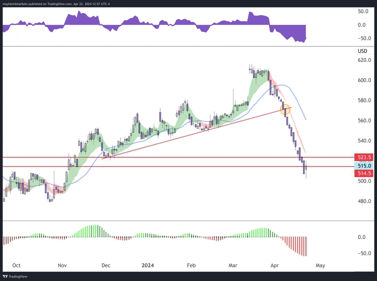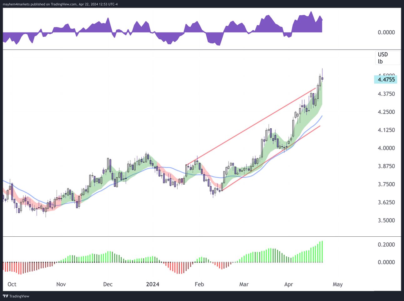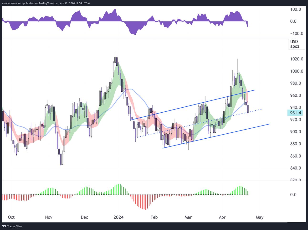 Lumber fell below the area of support we identified last week and now is seeing a bit of a bid, trading at $515, above our lower support band. We think we could see some consolidation here after a rather aggressive sell-off, but the path of least resistance likely remains lower over the intermediate term as new home building slows with rising rates.
