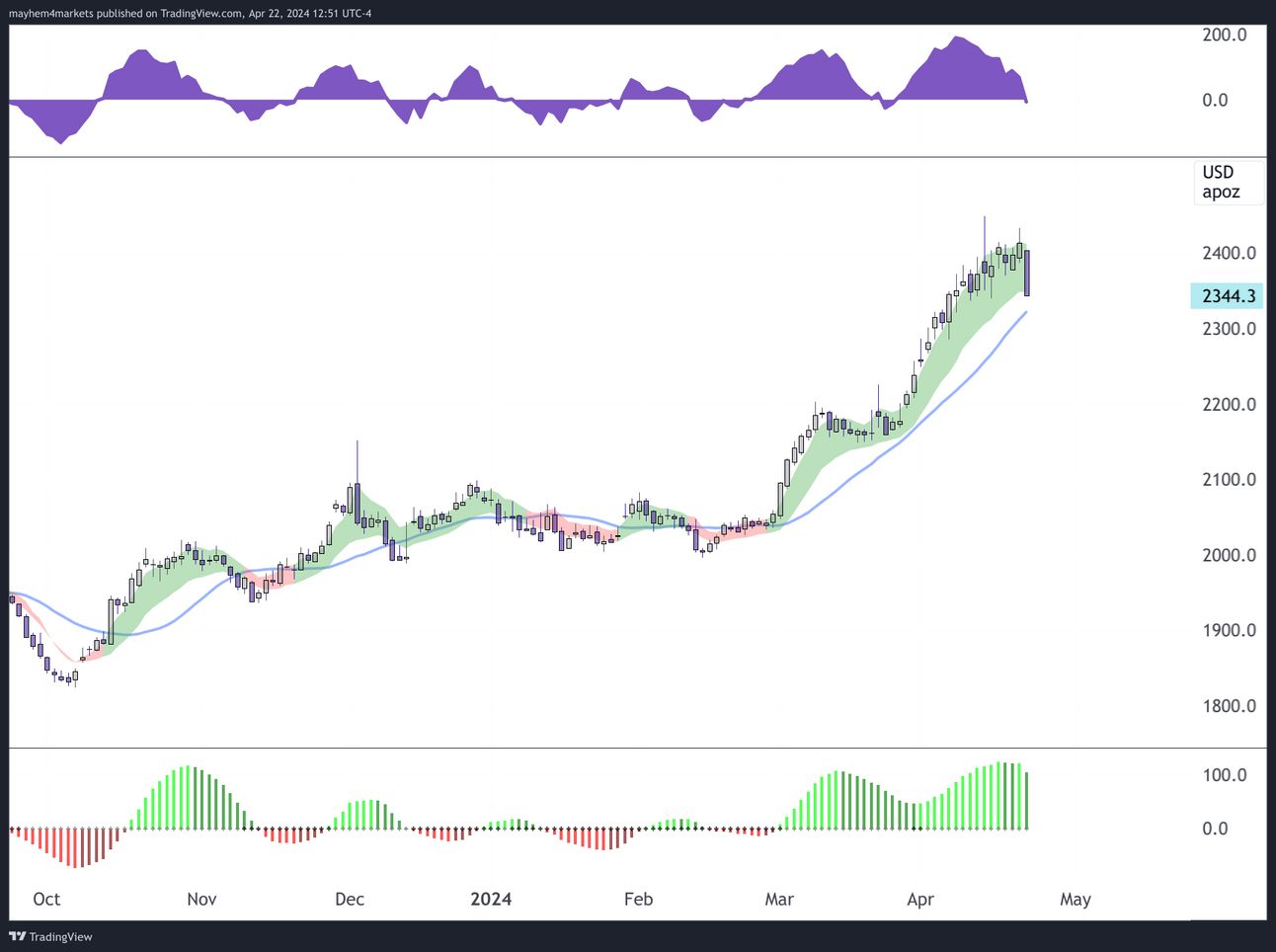 The precious metal’s positive momentum is fading after corrective selling pressure today, but it remains in an overall intermediate-term uptrend. We would be interested in buying some additional gold exposure at $2,190. We also believe that could be a decent time to add to AEM, RGLD, NEM, and WPM.