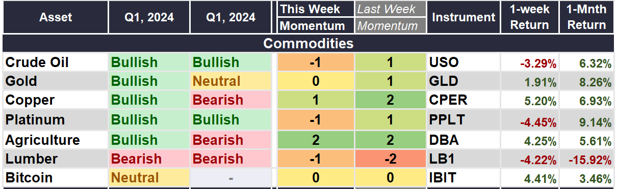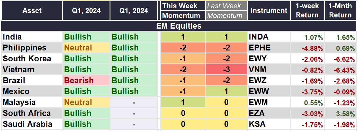 China left its loan prime rates unchanged. The markets are projecting cuts this quarter, and we may see that later, perhaps in June. For now, momentum remains neutral. We’re not seeing enough bullishness in equities in the short term but, if the current momentum continues, we may turn positive next week.