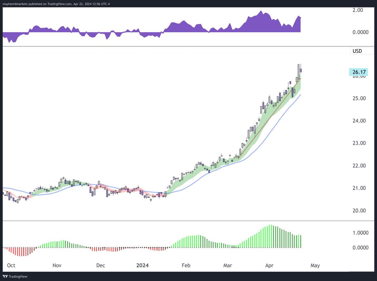 It doesn’t seem like anything can stop ag from moving higher, and now we’re seeing soy, corn, wheat and oats picking up as well as sugar, even as cocoa is becoming much more volatile. We believe that DBA can continue to move higher over the intermediate term, but that we may see some near-term consolidation as agricultural leadership is seeing a potential rotation into grains and other softs.