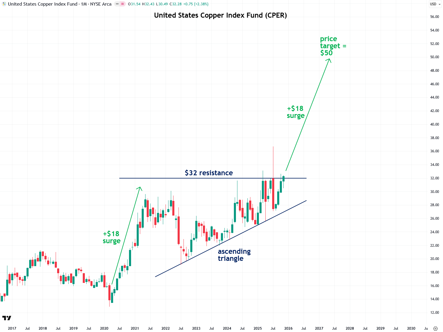 The one caveat is that CPER must close decisively above the $32 resistance level and remain above it for the bullish thesis to stay valid. If it were to break out briefly but then close solidly back below that level, that would be my signal to cut losses.