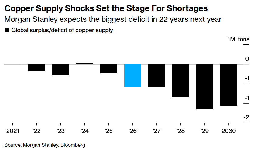 In addition, Morgan Stanley forecasts that the global copper market will face its most severe deficit in over 20 years by 2026, due to mine supply setbacks and tariff-driven trade disruptions, as reported in the Bloomberg article from which the chart below is sourced.