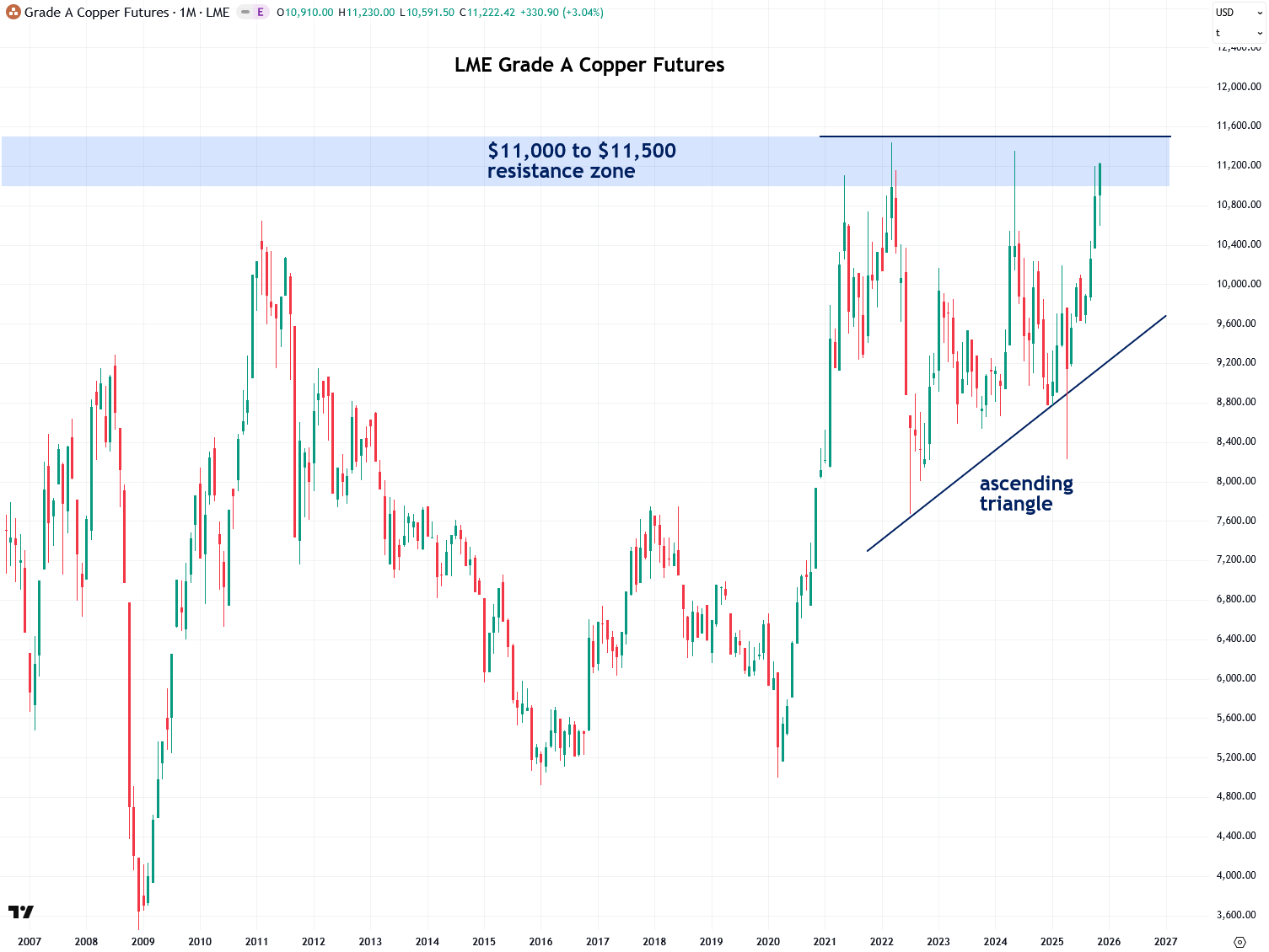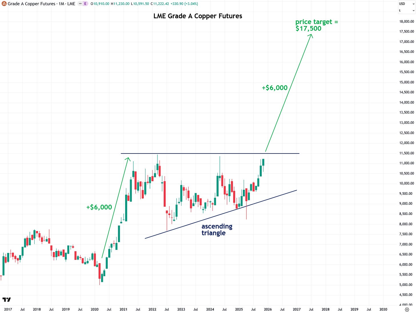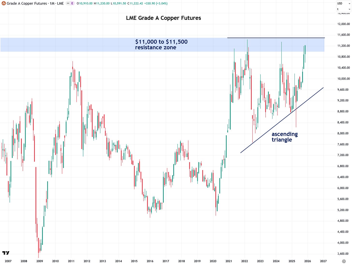 Zooming out to the bigger picture over the past two decades reveals both the ascending triangle and the key $11,000 to $11,500 resistance zone highlighted in the previous chart. I believe that once copper closes decisively above this zone, it will mark the beginning of a truly epic bull market, and I am very excited about what lies ahead.