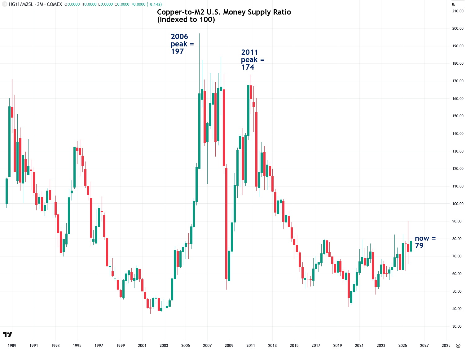 For example, the chart below shows the ratio of copper to the U.S. M2 money supply, indexed to 100. The current index value is just 79, compared to prior peaks of 197 in 2006 and 174 in 2011. While copper may be at an all-time high in nominal terms, it is not in real terms, and that is what truly matters.
