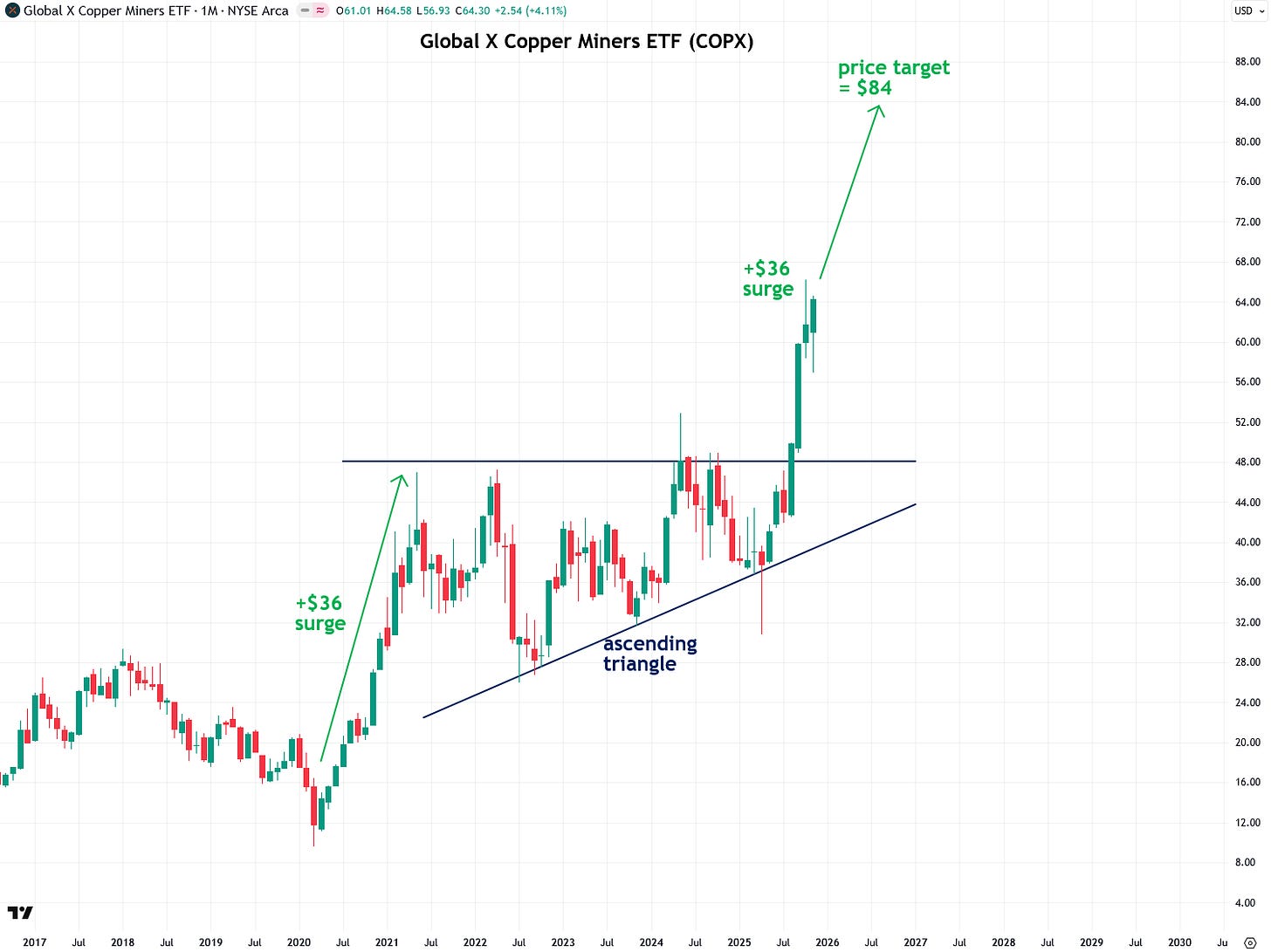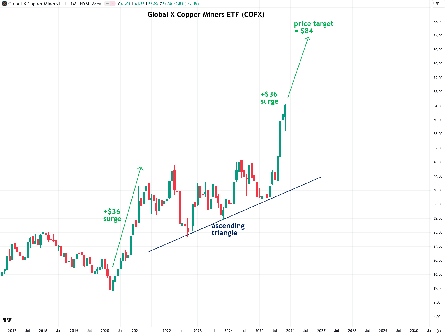 I also like the Global X Copper Miners ETF, symbol COPX, and I alerted subscribers to its bullish setup back in March. Since then, it has broken out just as I expected. I still believe it has room to run and should rise to around $84 based on the measured move principle.