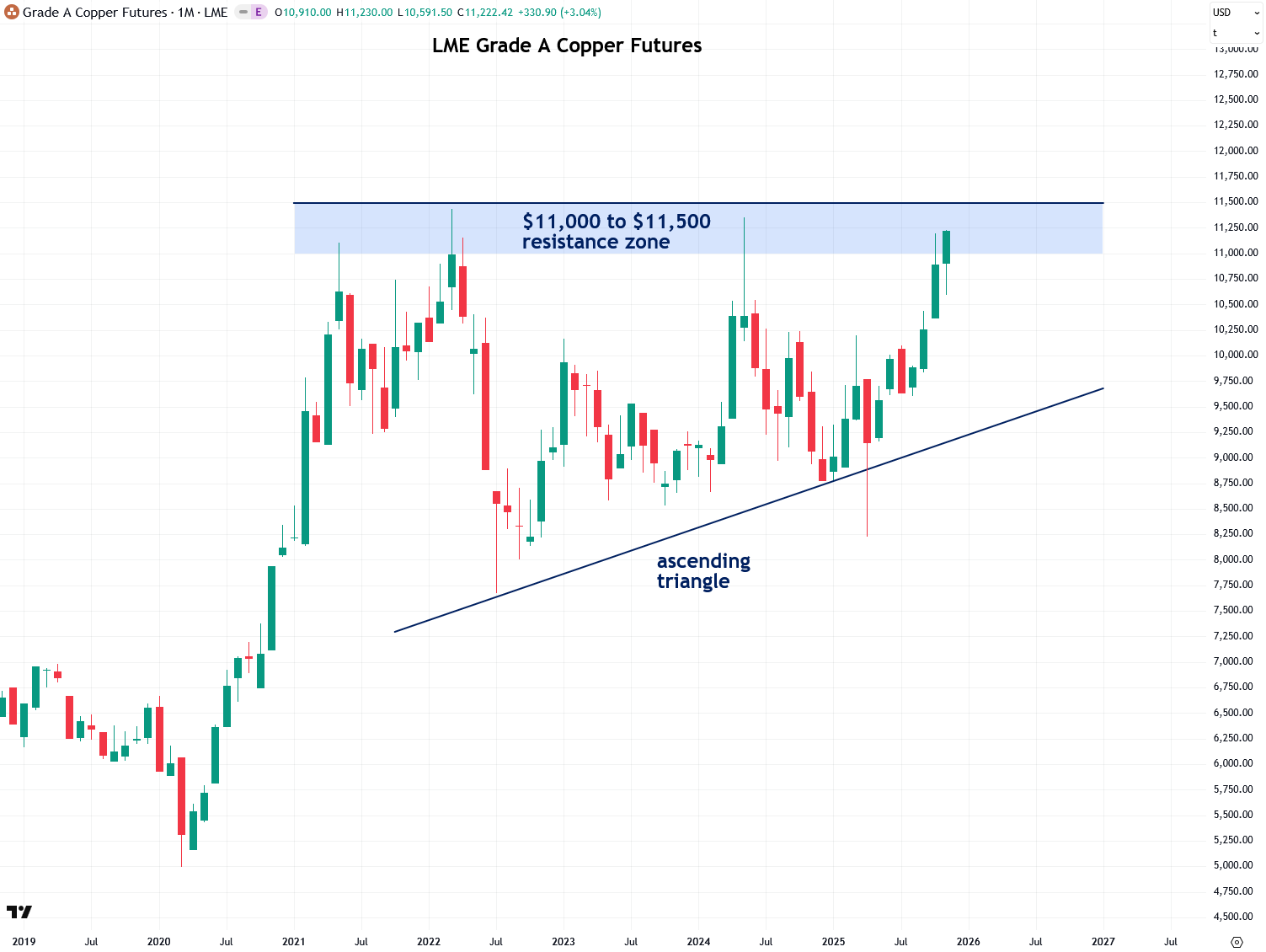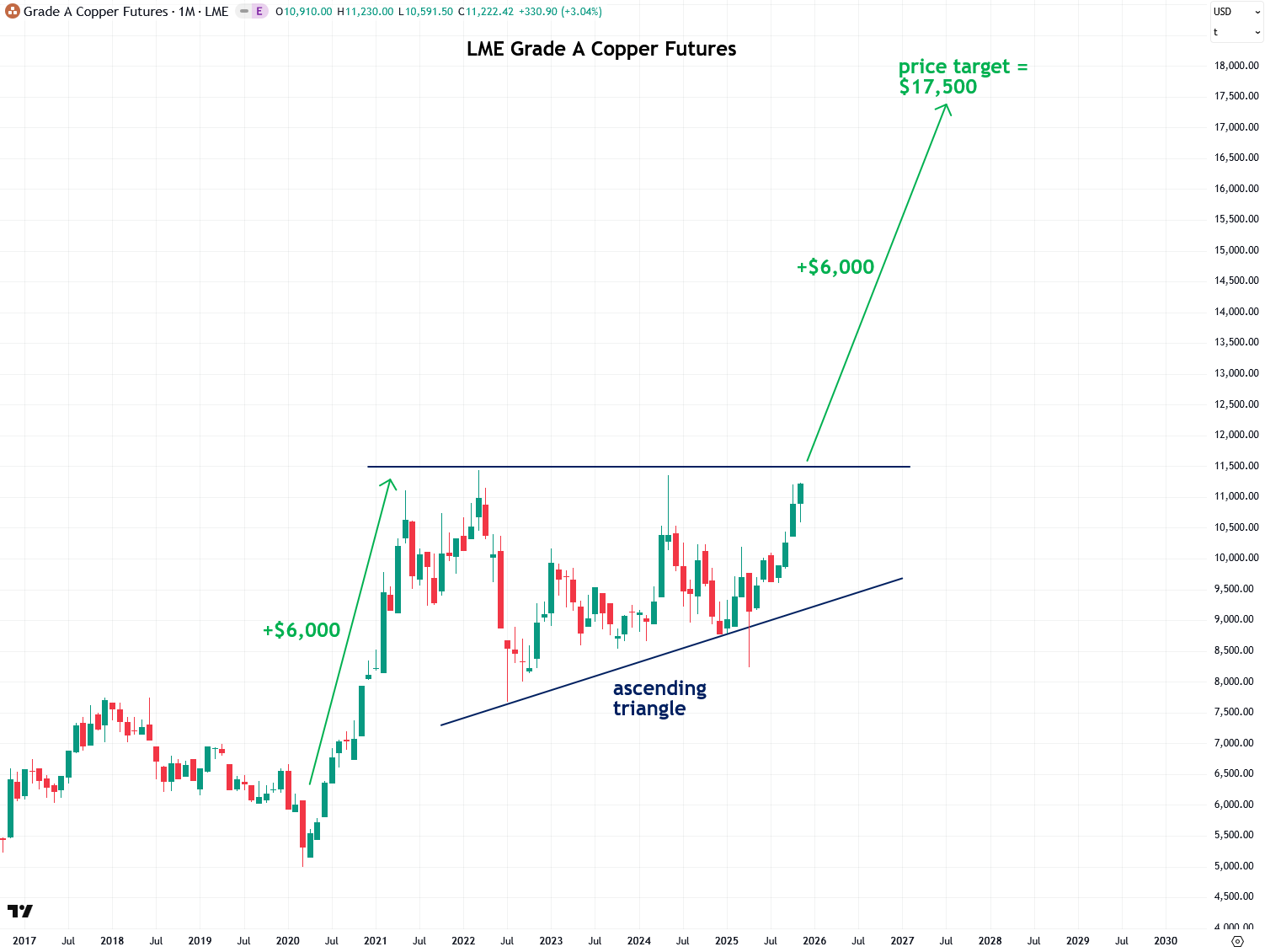 Copper’s ascending triangle pattern allows us to project a price target using a powerful and useful technical analysis method called a measured move. To apply it, we measure the size of the move leading into the pattern, which in this case was $6,000 per metric tonne.