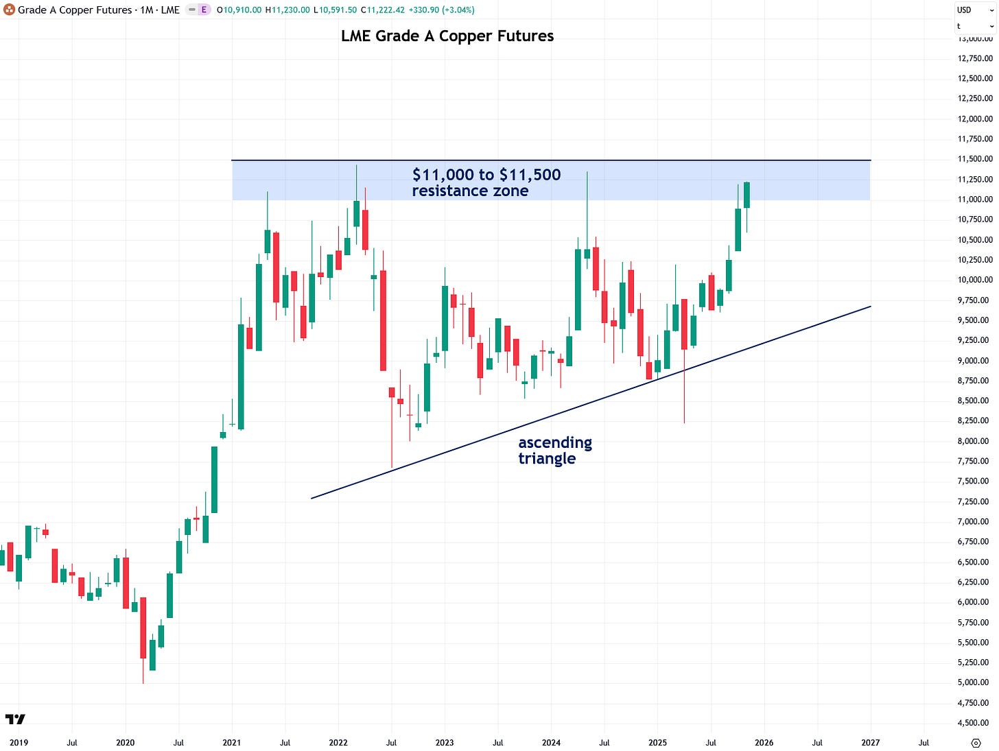 So let’s take a look at what’s happening in the chart of Grade A copper futures traded on the London Metal Exchange (LME). I prefer following that contract instead of the more popular High Grade Copper futures traded on the U.S. COMEX exchange, ever since the Trump administration’s bungled tariff announcements this spring caused severe price distortions and made COMEX futures copper virtually useless for technical analysis, as I explained in a previous update. Like COMEX copper, LME copper futures are priced in U.S. dollars, but quoted per metric tonne rather than per pound.