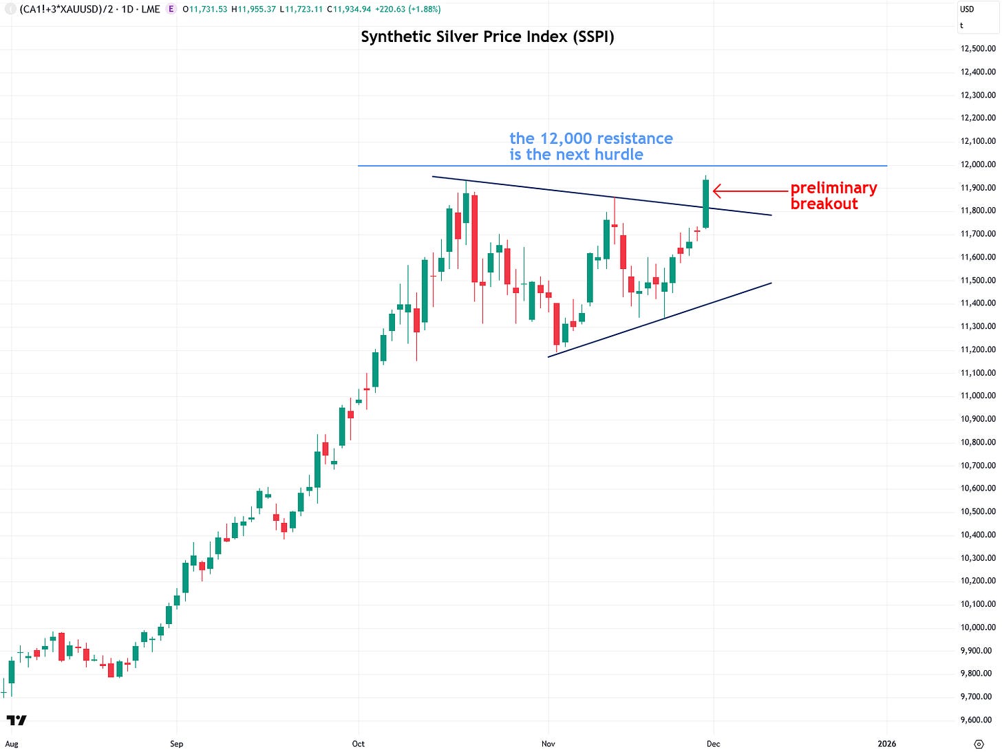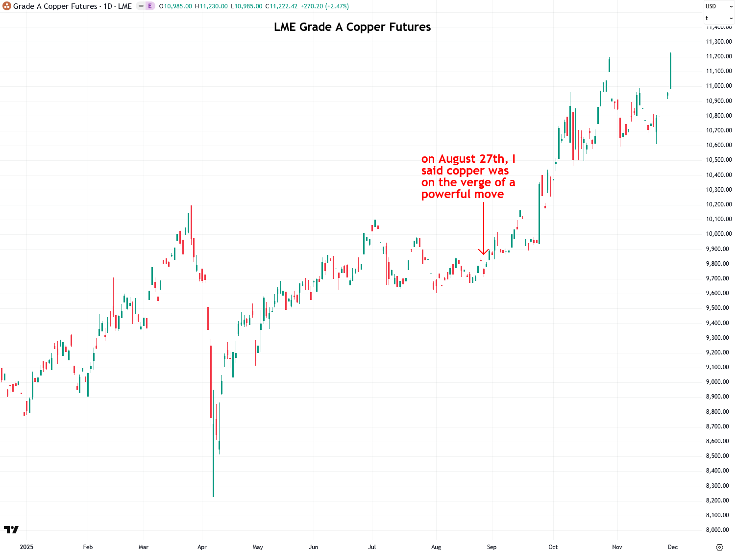 Back on August 27th, I published a report highlighting a volatility squeeze in copper, which I anticipated would lead to a significant move in both copper and silver. Over the past three months, that scenario has played out perfectly, with copper surging to a new all-time high of $11,222 per tonne on Friday. In my view, this move is only just beginning. There are several factors driving copper’s recent breakout, and I’ll dive into those later in the report, after covering the technical analysis portion.